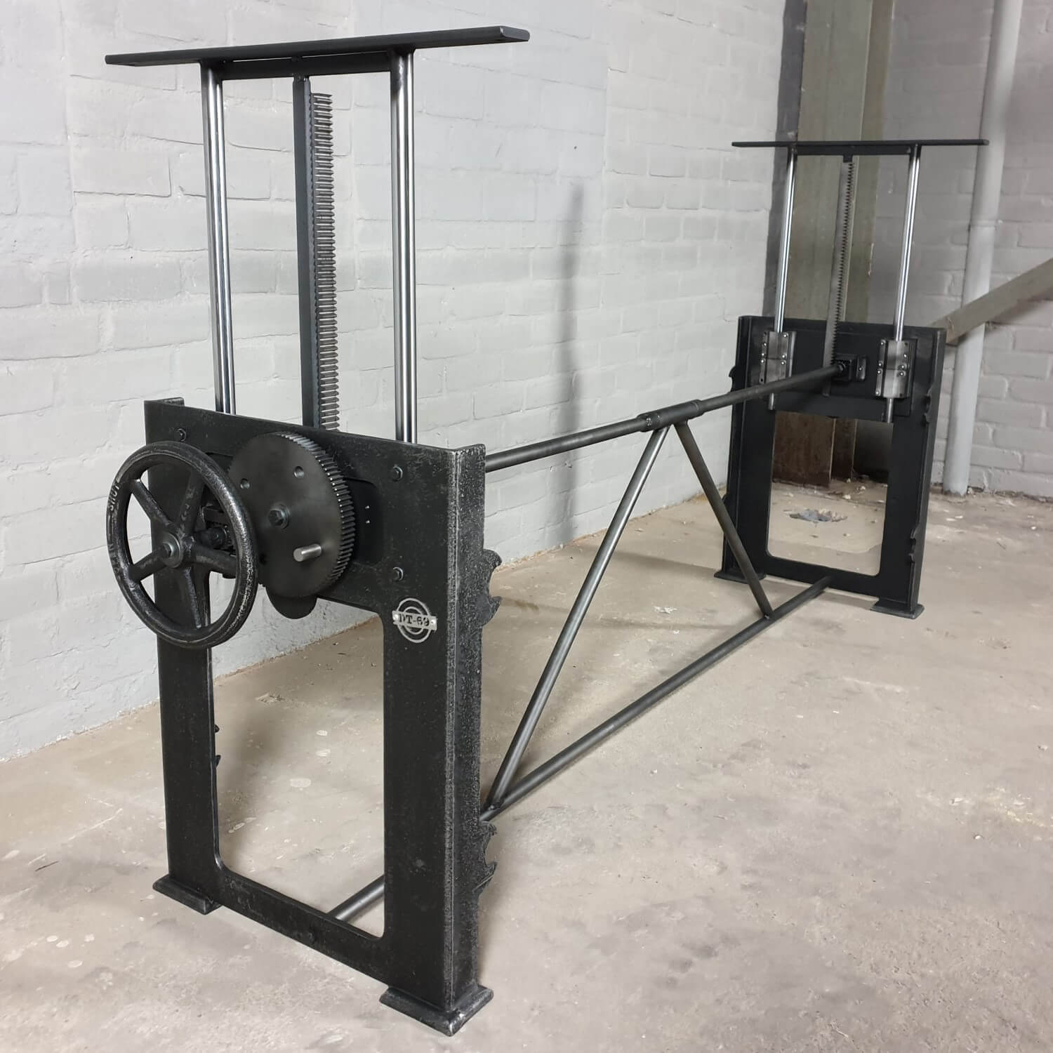 Untergestelle bis L 250cm haben ein einziges Zahnrad. Wenn eine Tischplatte mehr wiegt als 110kg raten wir ein zusätzliches Zahnrad: 395,– Euro Aufpreis.