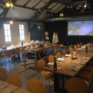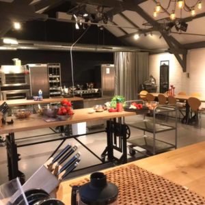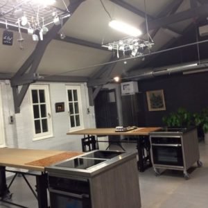 Die Tische sind für die Kochschule bestimmt. Sie sind in der Höhe verstellbar, so dass jede Zielgruppe (Kinder, Unternehmen und Einzelpersonen) an ihnen arbeiten und essen kann.